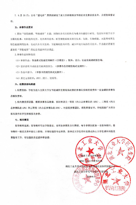 5. 全国大学生节能减排竞赛申报书填写与作品申报:2018 年 5 月 15 日——2018 年 5 月 18 日