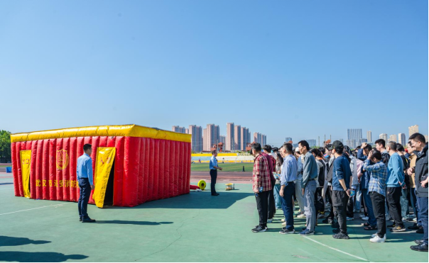 培训会后,在演练现场,教官们首先用消防逃生体验屋摸拟火灾场景,组织师生有序疏散;然后,详细演示灭火器使用步骤;最后,用汽油火盆模拟火灾现场,指导师生使用干粉灭火器开展初起火灾的扑灭演练。